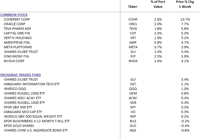 For the week, the tech-heavy Nasdaq Composite rose +0.91%, the small-cap Russell 2000 climbed +0.84%, the Dow Jones Industrial Average added +0.5%, and the S&P 500 posted a more modest +0.3%. Year-to-date through Thursday’s close, the S&P 500 is now up a robust 16.8%, while the Nasdaq has gained an impressive 22.1%, the DBS Long Term Growth Portfolio is up approximately 24%..