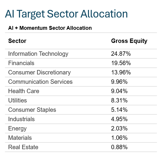 The AI + Momentum Sector Allocation strategy leverages artificial intelligence to dynamically optimize portfolio weights across U.S. equity sectors, combining predictive analytics with momentum signals to target outperforming areas while maintaining broad diversification. This AI-driven approach aims to enhance risk-adjusted returns by rotating toward high-momentum sectors amid evolving AI themes.