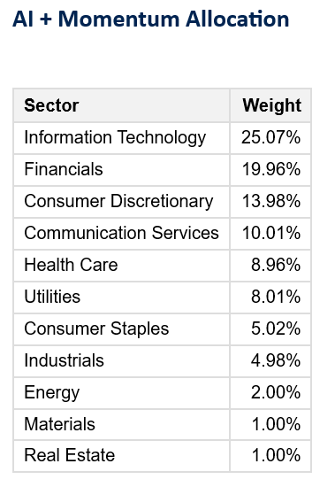 The AI + Momentum Sector Allocation strategy leverages artificial intelligence to dynamically optimize portfolio weights across U.S. equity sectors, combining predictive analytics with momentum signals to target outperforming areas while maintaining broad diversification. This AI-driven approach aims to enhance risk-adjusted returns by rotating toward high-momentum sectors amid evolving AI themes.