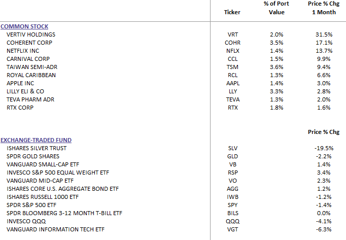 Stock markets were mixed during the month, although supported by strong earnings and continued business investment. Large technology companies and firms building artificial intelligence infrastructure remain key drivers of market performance. (See Taiwan Semi., Vertive Holdings, and Coherent Corp. performance below). Companies continue investing in automation and digital tools to improve productivity and offset labor costs. Market gains have also broadened modestly beyond the largest technology firms, with industrial and automation companies benefiting from infrastructure spending and supply chain reshoring. International stocks also advanced and may offer attractive valuations compared with U.S. markets.