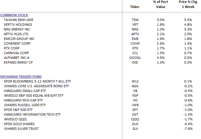 Overall, the abbreviated week was down slightly, but 2025 delivered robust returns: S&P 500 +16.4%, Nasdaq +20.4%, Dow +13%. Broader participation emerged late in the year, with small-caps (Russell 2000 +11%) and international markets outperforming in pockets. AI remained the dominant theme, though mega-cap tech faced rotation pressures.
