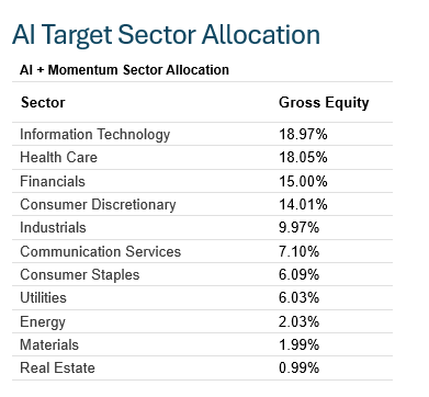 The AI + Momentum Sector Allocation strategy leverages artificial intelligence to dynamically optimize portfolio weights across U.S. equity sectors, combining predictive analytics with momentum signals to target outperforming areas while maintaining broad diversification. This AI-driven approach aims to enhance risk-adjusted returns by rotating toward high-momentum sectors amid evolving AI themes.