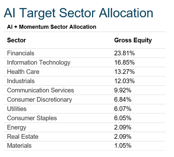 The AI + Momentum Sector Allocation strategy leverages artificial intelligence to dynamically optimize portfolio weights across U.S. equity sectors, combining predictive analytics with momentum signals to target outperforming areas while maintaining broad diversification. This AI-driven approach aims to enhance risk-adjusted returns by rotating toward high-momentum sectors amid evolving AI themes.
