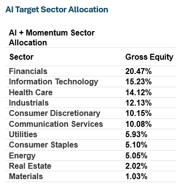 The AI + Momentum Sector Allocation strategy leverages artificial intelligence to dynamically optimize portfolio weights across U.S. equity sectors, combining predictive analytics with momentum signals to target outperforming areas while maintaining broad diversification. This AI-driven approach aims to enhance risk-adjusted returns by rotating toward high-momentum sectors amid evolving AI themes.