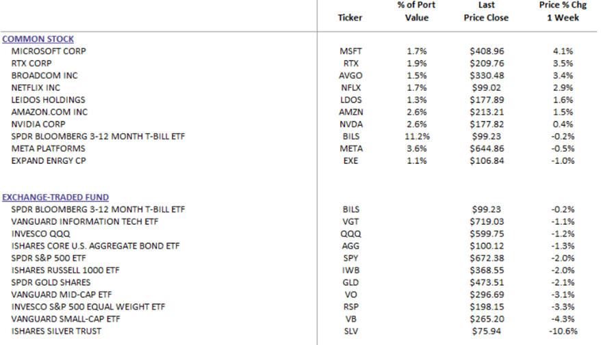 This modest drawdown reflects disciplined positioning and a defensive posture: we currently maintain 15% liquidity (11% in BILS—the SPDR Bloomberg 3-12 Month T-Bill ETF, providing stable, short-duration Treasury exposure with yields around 4%—and 4% in cash). This dry powder positions us well to deploy capital opportunistically once we identify attractive entry points during the current sell-off.