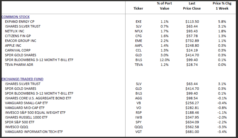 In summary, it was a challenging week for equities, with the S&P 500 and Dow extending losses amid ceasefire uncertainty and rising energy costs. The bright spot has been the continued broadening of market participation and resilience in certain value-oriented and commodity-linked areas. Volatility is likely to remain elevated until the geopolitical picture clarifies. Please remember, we still have 16% liquidity available to deploy at the appropriate time.