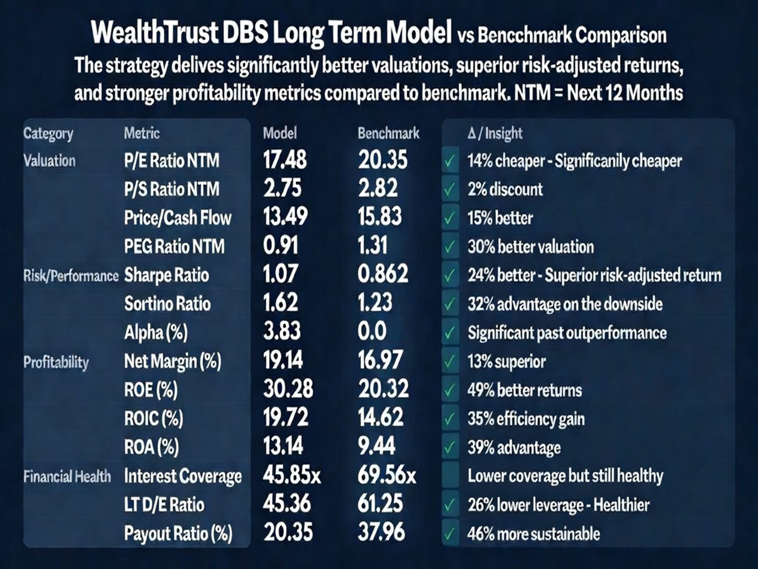 Out of 14 total metric comparisons, 13 are favorable for the DBS Long Term Growth Strategy .