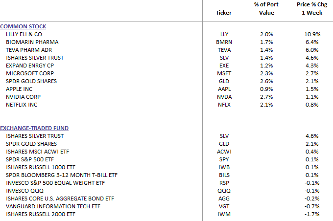 U.S. equities ended the week on a mixed note. The Dow Jones Industrial Average and S&P 500 posted modest weekly gains, while the Nasdaq Composite, S&P MidCap 400, and Russell 2000 all finished in the red. The divergence reflected a continued rotation out of growth-oriented names—particularly in technology and artificial intelligence—that have powered the bull market to repeated all-time highs.