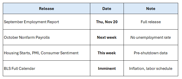 With the government reopened, economic data flow will normalize—but expect gaps and revisions: